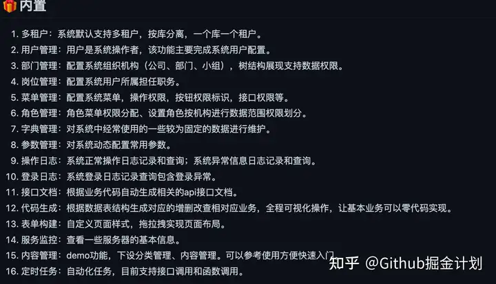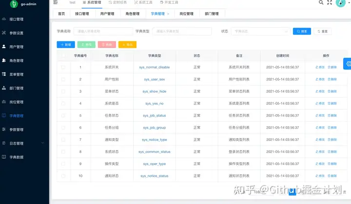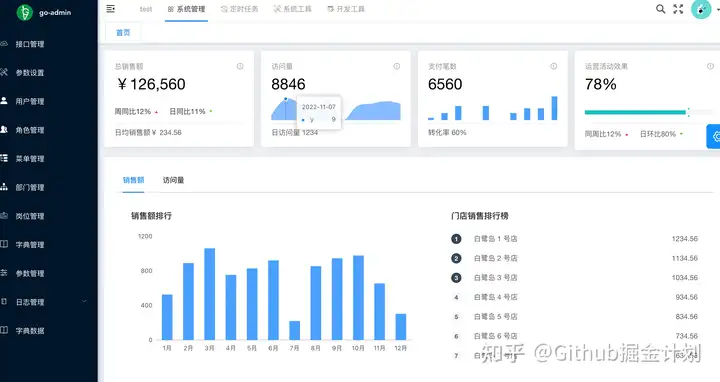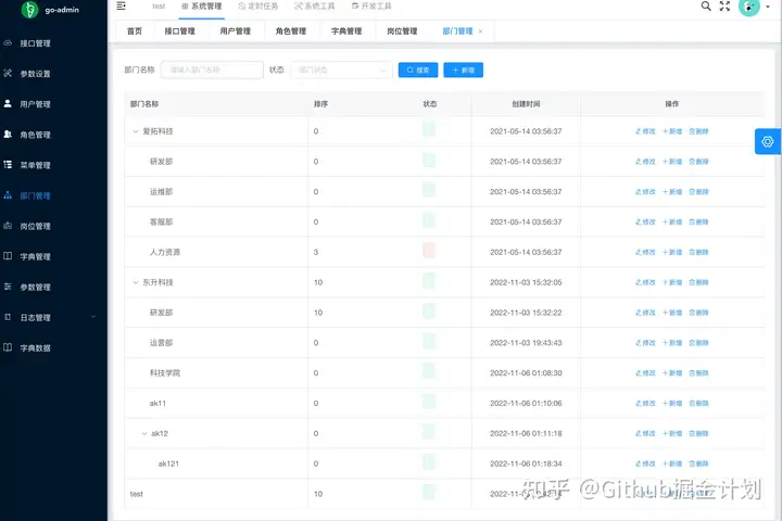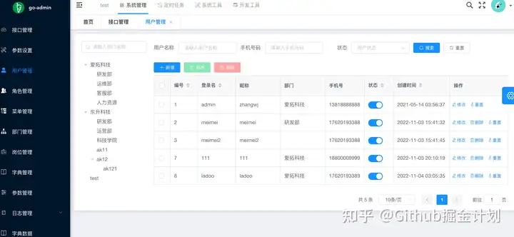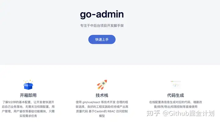 go-admin 是一个基于 Gin + Vue + Element UI OR Arco Design OR Ant Design 的前后端分离权限管理系统,提供了很多开箱即用的功能比如多租户、用户管理、部门管理、岗位管理、菜单管理、代码生成、字典管理。